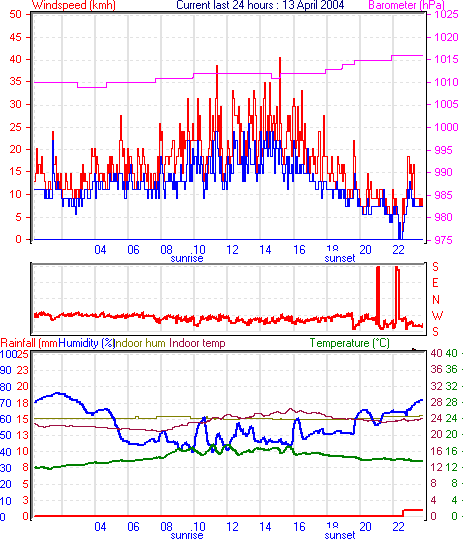 Averages\Extremes for the month of April to 30 2004 ------------------------------------------------------ Average temperature 15.8 °C Average humidity 67 % Average dewpoint 9.3 °C Average barometer 1016 hPa Average windspeed 9 kmh Average gustspeed 12 kmh Average direction 192 ° (SSW) Rainfall for month 41.0 mm Rainfall for year 354.0 mm ----------------------------------------------------------- Maximum rain per minute 2.0 mm on day 29 at time 11:36 Maximum temperature 22.9 °C on day 02 at time 12:29 Minimum temperature 7.6 °C on day 08 at time 04:50 Maximum humidity 94 % on day 17 at time 07:44 Minimum humidity 34 % on day 06 at time 15:13 Minimum pressure 1003.0 hPa on day 09 at time 04:41 Maximum pressure 1029.0 hPa on day 15 at time 10:56 Maximum windspeed 33.3 kmh from 018° on day 08 at time 16:56 Maximum gust speed 48.1 kmh from 217° on day 09 at time 15:53 Maximum heat index 26.2 °C on day 22 at time 10:53 Growing degrees days : 461.4 °C ------------------------------------------------------------ Daily rain totals 6.0 mm on day 6 3.0 mm on day 7 1.0 mm on day 11 1.0 mm on day 12 1.0 mm on day 25 7.0 mm on day 27 22.0 mm on day 29 ------------------------------------------------------------