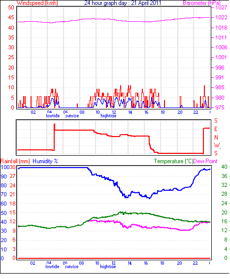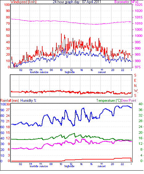 Maximum windspeed = 46.3 kmh from 225°( SW) on day 18 at time 11:51