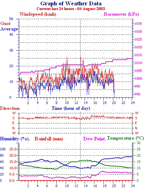 Averages\Extremes for the month of August to 31 2003 ------------------------------------------------------ Average temperature 12.3 °C Average humidity 71 % Average dewpoint 6.8 °C Average barometer 1010 hPa Average windspeed 8 kmh Average gustspeed 11 kmh Average direction 128 ° ( SE) Rainfall for month 52.0 mm Rainfall for year 609.0 mm ----------------------------------------------------------- Maximum rain per minute 2.0 mm on day 15 at time 19:52 Maximum temperature 18.2 °C on day 24 at time 14:19 Minimum temperature 5.3 °C on day 06 at time 07:35 Maximum humidity 97 % on day 28 at time 06:58 Minimum humidity 36 % on day 30 at time 11:33 Minimum pressure 987.0 hPa on day 21 at time 16:37 Maximum pressure 1021.0 hPa on day 06 at time 10:52 Maximum windspeed 25.9 kmh from 012° on day 15 at time 14:08 Maximum gust speed 35.2 kmh from 125° on day 23 at time 14:05 Maximum heat index 26.2 °C on day 31 at time 14:25 Growing degrees days : 260.9 °C ------------------------------------------------------------ Daily rain totals 2.0 mm on day 8 1.0 mm on day 10 18.0 mm on day 11 6.0 mm on day 15 1.0 mm on day 20 7.0 mm on day 21 1.0 mm on day 26 12.0 mm on day 28 ------------------------------------------------------------