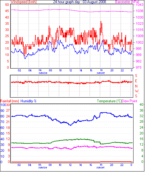 Maximum windspeed = 46.3 kmh from 00 °( N ) on day 24 at time 13:03