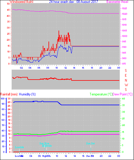 Maximum windspeed = 31.5 kmh from 270°( W ) on day 12 at time 14:07