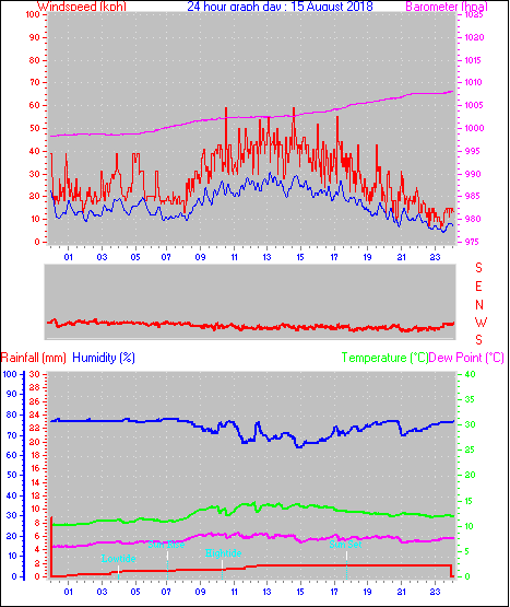 Maximum windspeed = 37.0 kmh from 270°( W ) on day 14 at time 11:08