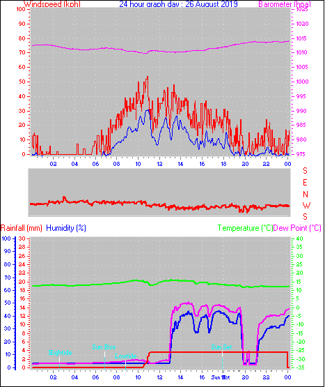 Maximum windspeed = 38.9 kmh from 203°(SSW) on day 24 at time 11:35