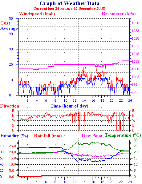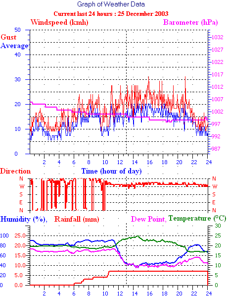 Averages\Extremes for the month of December to 31 2003 ------------------------------------------------------ Average temperature 19.8 °C Average humidity 64 % Average dewpoint 12.2 °C Average barometer 1011 hPa Average windspeed 10 kmh Average gustspeed 13 kmh Average direction 273 ° ( W ) Rainfall for month 65.0 mm Rainfall for year 911.0 mm ----------------------------------------------------------- Maximum rain per minute 1.0 mm on day 30 at time 07:48 Maximum temperature 29.9 °C on day 13 at time 14:48 Minimum temperature 11.2 °C on day 01 at time 05:55 Maximum humidity 96 % on day 11 at time 07:46 Minimum humidity 27 % on day 17 at time 15:03 Minimum pressure 998.0 hPa on day 25 at time 05:37 Maximum pressure 1020.0 hPa on day 04 at time 11:54 Maximum windspeed 31.5 kmh from 219° on day 30 at time 17:57 Maximum gust speed 46.3 kmh from 224° on day 30 at time 18:28 Maximum heat index 30.2 °C on day 12 at time 15:02 Growing degrees days : 612.9 °C ------------------------------------------------------------ Daily rain totals 1.0 mm on day 4 3.0 mm on day 8 21.0 mm on day 9 15.0 mm on day 10 1.0 mm on day 11 2.0 mm on day 22 7.0 mm on day 24 12.0 mm on day 29 4.0 mm on day 30 ------------------------------------------------------------