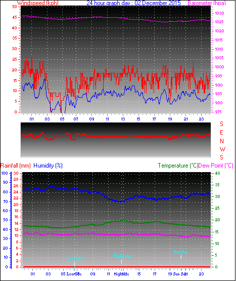 Maximum windspeed = 16.7 km/h on day 02 at time 02:36