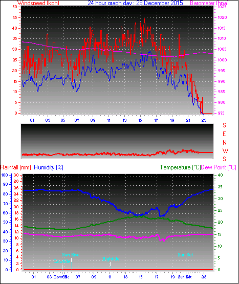 Maximum windspeed = 27.8 km/h on day 31 at time 23:03