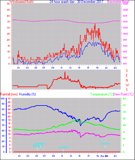 Maximum windspeed = 33.3 kmh from 203°(SSW) on day 28 at time 18:21