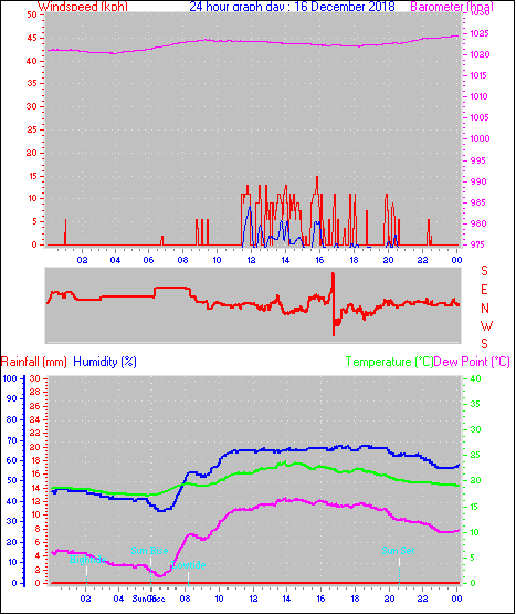 Maximum windspeed = 29.6 kmh from 203°(SSW) on day 07 at time 16:24