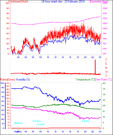 Maximum windspeed = 44.4 kmh from 203°(SSW) on day 23 at time 17:43