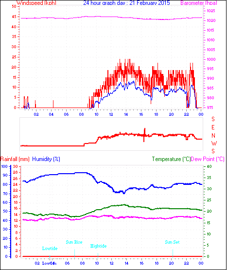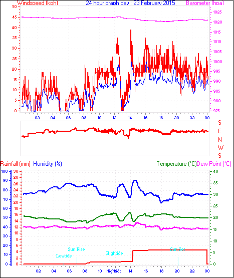 Maximum windspeed = 44.4 kmh from 225°( SW) on day 06 at time 14:34