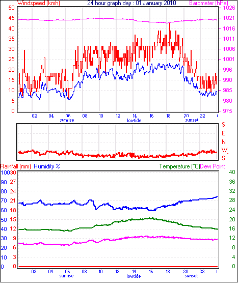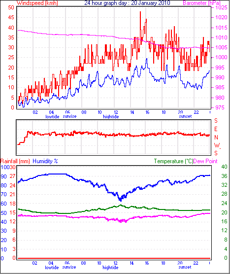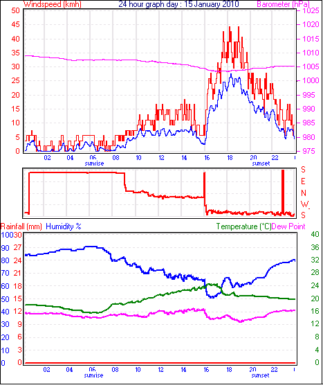 Maximum windspeed = 40.7 kmh from 203°(SSW) on day 22 at time 14:45