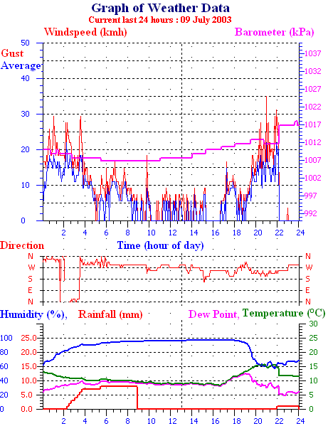 Averages\Extremes for the month of July to 31 2003 ------------------------------------------------------ Average temperature 10.7 °C Average humidity 73 % Average dewpoint 5.8 °C Average barometer 101 kpa Average windspeed 7 kmh Average gustspeed 10 kmh Average direction 167 ° (SSE) Rainfall for month 72.0 mm Rainfall for year 557.0 mm ----------------------------------------------------------- Maximum rain per minute 1.0 mm on day 31 at time 15:47 Maximum temperature 16.8 °C on day 16 at time 13:46 Minimum temperature 3.8 °C on day 06 at time 08:21 Maximum humidity 97 % on day 29 at time 07:14 Minimum humidity 36 % on day 20 at time 14:08 Minimum pressure 98.7 kpa on day 04 at time 06:21 Maximum pressure 103.2 kpa on day 24 at time 10:23 Maximum windspeed 33.3 kmh from 205° on day 04 at time 13:17 Maximum gust speed 46.3 kmh from 221° on day 04 at time 13:58 Maximum heat index 16.8 °C on day 16 at time 13:46 Growing degrees days : 320.3 °C ------------------------------------------------------------ Daily rain totals 2.0 mm on day 1 2.0 mm on day 2 7.0 mm on day 3 9.0 mm on day 4 6.0 mm on day 5 8.0 mm on day 7 1.0 mm on day 8 2.0 mm on day 10 3.0 mm on day 11 1.0 mm on day 16 1.0 mm on day 18 2.0 mm on day 19 12.0 mm on day 28 14.0 mm on day 29 1.0 mm on day 30 ------------------------------------------------------------