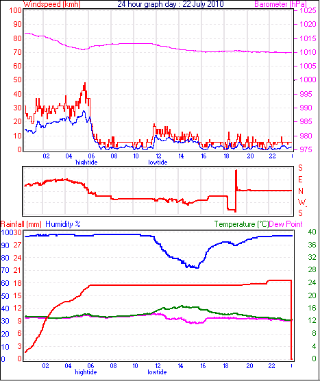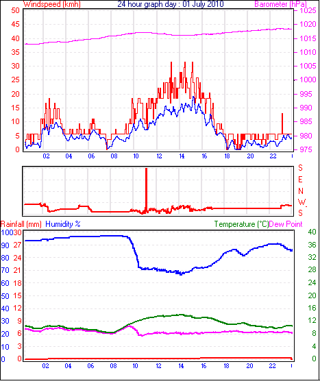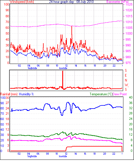 Maximum windspeed = 42.6 kmh from 203°(SSW) on day 07 at time 16:12