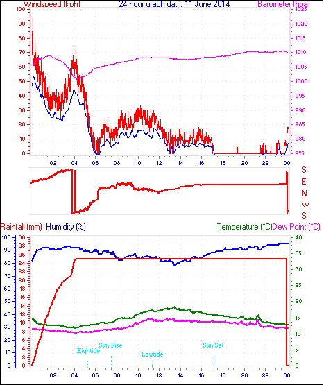 Maximum windspeed = 64.8 kmh from 068°(ENE) on day 11 at time 00:05