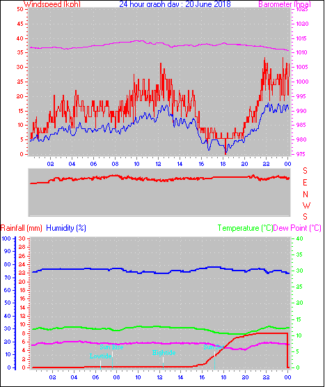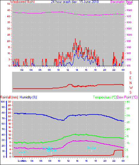 Maximum windspeed = 35.2 kmh from 225°( SW) on day 05 at time 13:09