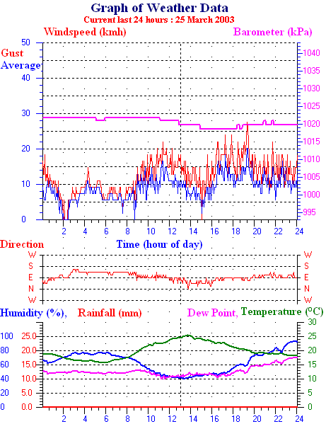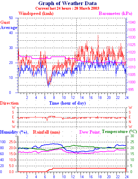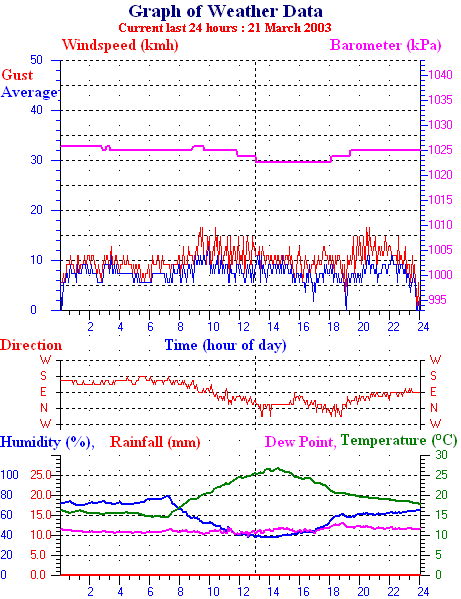 Average temperature 20.9 °C Average humidity 68 % Average dewpoint 14.6 °C Average barometer 101.9 kpa Average windspeed 13.4 kmh Average gustspeed 18.5 kmh Average direction 82 ° ( E ) Rainfall for month 96.0 mm Rainfall for year 239.0 mm ----------------------------------------------------------- Maximum rain per minute 0.0 mm on day 26 at time 00:02 Maximum temperature 24.6 °C on day 26 at time 15:49 Minimum temperature 18.7 °C on day 26 at time 02:57 Maximum windspeed 20.4 kmh from 079° on day 26 at time 21:50 Maximum gust speed 31.5 kmh from 091° on day 26 at time 20:44 Maximum humidity 77 % on day 26 at time 00:02 Minimum humidity 52 % on day 26 at time 13:25 Maximum heat index 25.7 °C on day 26 at time 15:49 Click here for todays 24 hour graph day:26 month:3 year:2003 Averages\Extremes for day :27 --------------------------------------------------- Average temperature 20.1 °C Average humidity 80 % Average dewpoint 16.5 °C Average barometer 101.6 kpa Average windspeed 15.9 kmh Average gustspeed 21.6 kmh Average direction 82 ° ( E ) Rainfall for month 99.0 mm Rainfall for year 242.0 mm ----------------------------------------------------------- Maximum rain per minute 1.0 mm on day 27 at time 07:39 Maximum temperature 22.3 °C on day 27 at time 12:22 Minimum temperature 18.0 °C on day 27 at time 06:39 Maximum windspeed 25.9 kmh from 081° on day 27 at time 20:14 Maximum gust speed 38.9 kmh from 078° on day 27 at time 17:50 Maximum humidity 94 % on day 27 at time 08:09 Minimum humidity 65 % on day 27 at time 13:21 Maximum heat index 24.0 °C on day 27 at time 13:21 Rain for the day :3.0 mm Click here for todays 24 hour graph day:27 month:3 year:2003 Averages\Extremes for day :28 ---------------------------------------------------