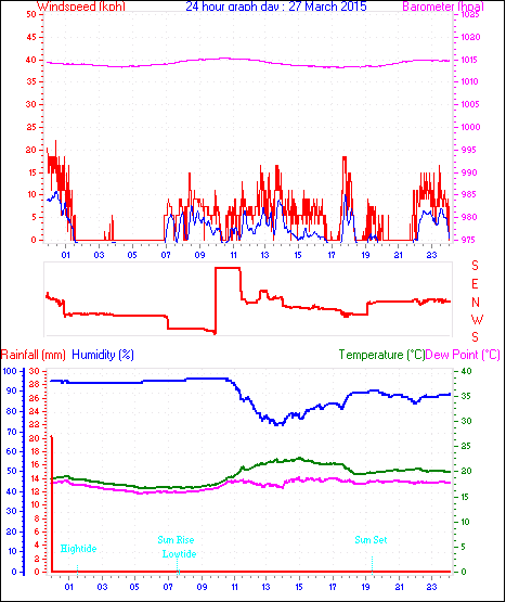 Maximum gust speed = 27.8 km/h from 068°(ENE) on day 03 at time 14:15