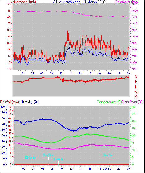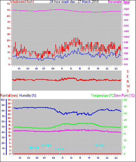 Maximum windspeed = 27.8 kmh from 203°(SSW) on day 14 at time 15:58