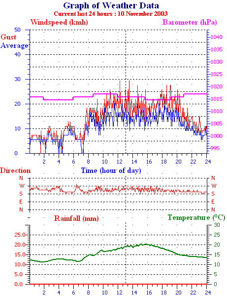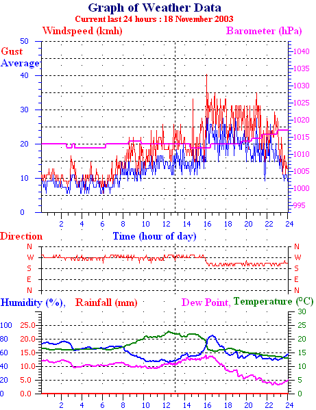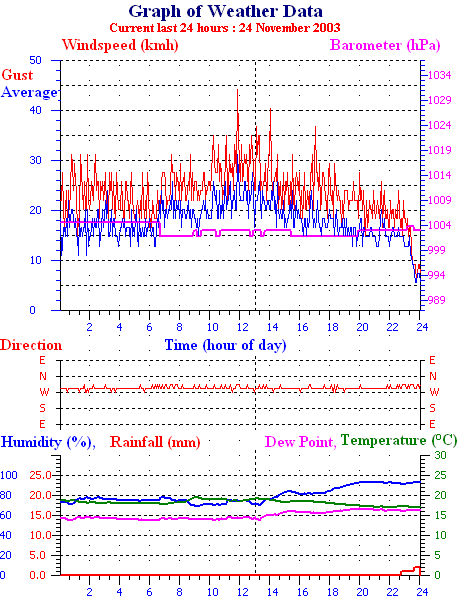 Averages\Extremes for the month of November to 30 2003 ------------------------------------------------------ Average temperature 16.1 °C Average humidity 61 % Average dewpoint 8.1 °C Average barometer 1009 hPa Average windspeed 12 kmh Average gustspeed 16 kmh Average direction 260 ° ( W ) Rainfall for month 48.0 mm Rainfall for year 846.0 mm ----------------------------------------------------------- Maximum rain per minute 2.0 mm on day 28 at time 12:57 Maximum temperature 25.1 °C on day 26 at time 15:16 Minimum temperature 9.0 °C on day 18 at time 06:29 Maximum humidity 97 % on day 24 at time 10:15 Minimum humidity 27 % on day 18 at time 14:47 Minimum pressure 988.0 hPa on day 27 at time 05:52 Maximum pressure 1023.0 hPa on day 19 at time 10:56 Maximum windspeed 35.2 kmh from 228° on day 27 at time 12:33 Maximum gust speed 51.8 kmh from 291° on day 02 at time 12:28 Maximum heat index 26.2 °C on day 30 at time 14:57 Growing degrees days : 453.0 °C ------------------------------------------------------------ Daily rain totals 1.0 mm on day 1 2.0 mm on day 2 9.0 mm on day 3 2.0 mm on day 4 1.0 mm on day 13 2.0 mm on day 23 10.0 mm on day 24 2.0 mm on day 25 12.0 mm on day 26 2.0 mm on day 27 4.0 mm on day 28 1.0 mm on day 29 ------------------------------------------------------------