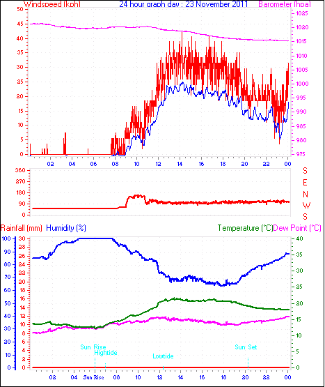 Maximum windspeed = 40.7 kmh from 225°( SW) on day 26 at time 14:07