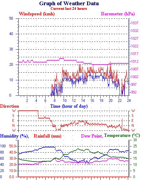 Maximum windspeed 25.9 kmh from 022° on day 06 at time 22:37