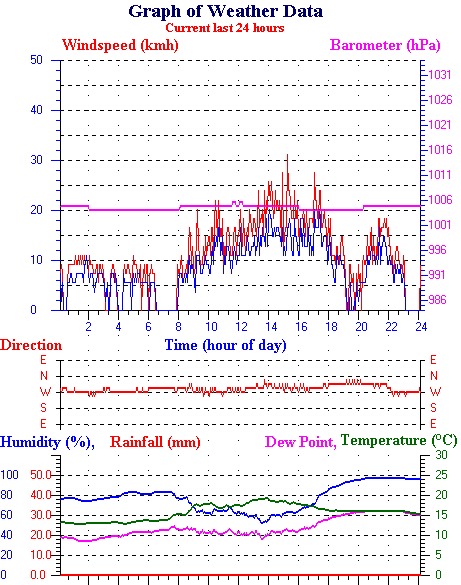 Maximum windspeed 31.5 kmh from 300° on day 29 at time 12:29