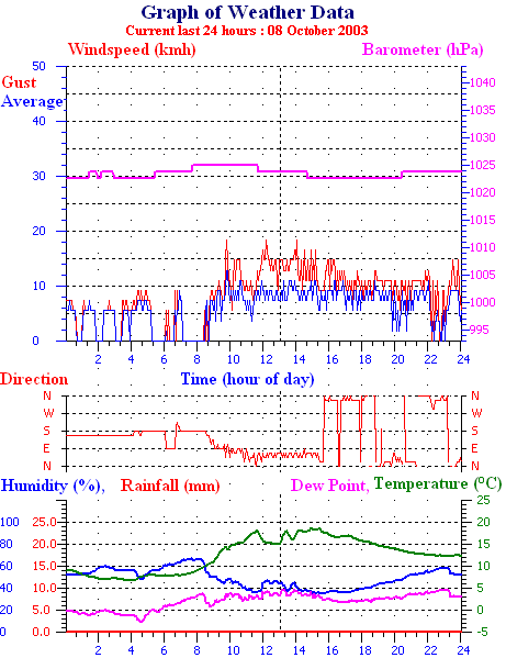 Averages\Extremes for the month of October to 31 2003 ------------------------------------------------------ Average temperature 14.7 °C Average humidity 64 % Average dewpoint 7.5 °C Average barometer 1010 hPa Average windspeed 11 kmh Average gustspeed 15 kmh Average direction 273 ° ( W ) Rainfall for month 79.0 mm Rainfall for year 798.0 mm ----------------------------------------------------------- Maximum rain per minute 1.0 mm on day 30 at time 16:14 Maximum temperature 24.2 °C on day 21 at time 14:25 Minimum temperature 6.7 °C on day 07 at time 04:07 Maximum humidity 97 % on day 03 at time 23:58 Minimum humidity 28 % on day 26 at time 15:12 Minimum pressure 990.0 hPa on day 03 at time 23:58 Maximum pressure 1025.0 hPa on day 07 at time 11:38 Maximum windspeed 38.9 kmh from 010° on day 03 at time 18:18 Maximum gust speed 59.2 kmh from 029° on day 12 at time 08:34 Maximum heat index 26.2 °C on day 31 at time 18:57 Growing degrees days : 428.4 °C ------------------------------------------------------------ Daily rain totals 7.0 mm on day 1 14.0 mm on day 4 2.0 mm on day 8 12.0 mm on day 9 5.0 mm on day 11 28.0 mm on day 12 2.0 mm on day 13 1.0 mm on day 21 2.0 mm on day 23 3.0 mm on day 28 3.0 mm on day 30 ------------------------------------------------------------