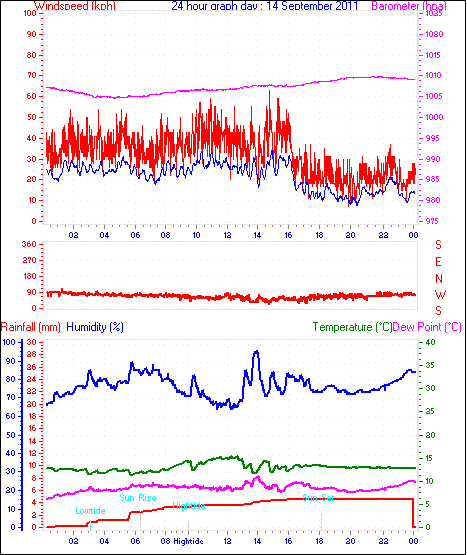 Maximum windspeed = 44.4 kmh from 225°( SW) on day 20 at time 15:37