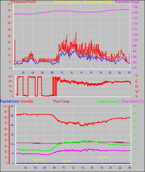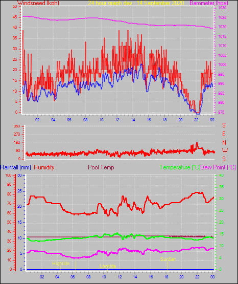 Maximum windspeed = 44.4 kmh from 260°( W ) on day 18 at time 11:19